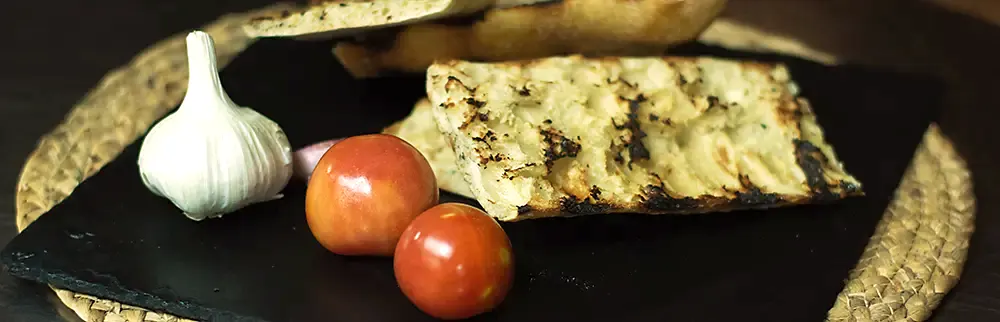 Pan a la brasa servido con tomate de colgar, aceite de oliva virgen y ajo.